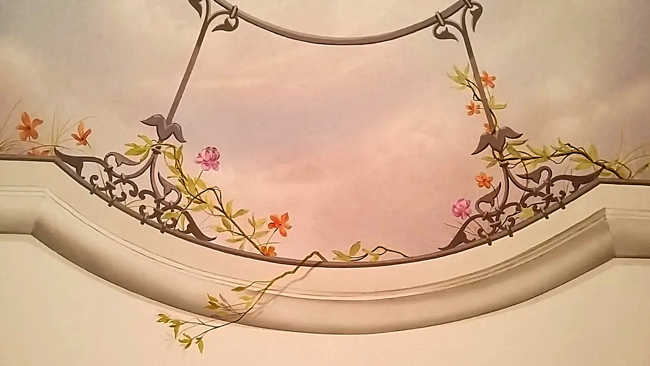 Trompe l'oeil sky and greenhouse, false molding and cast shadow