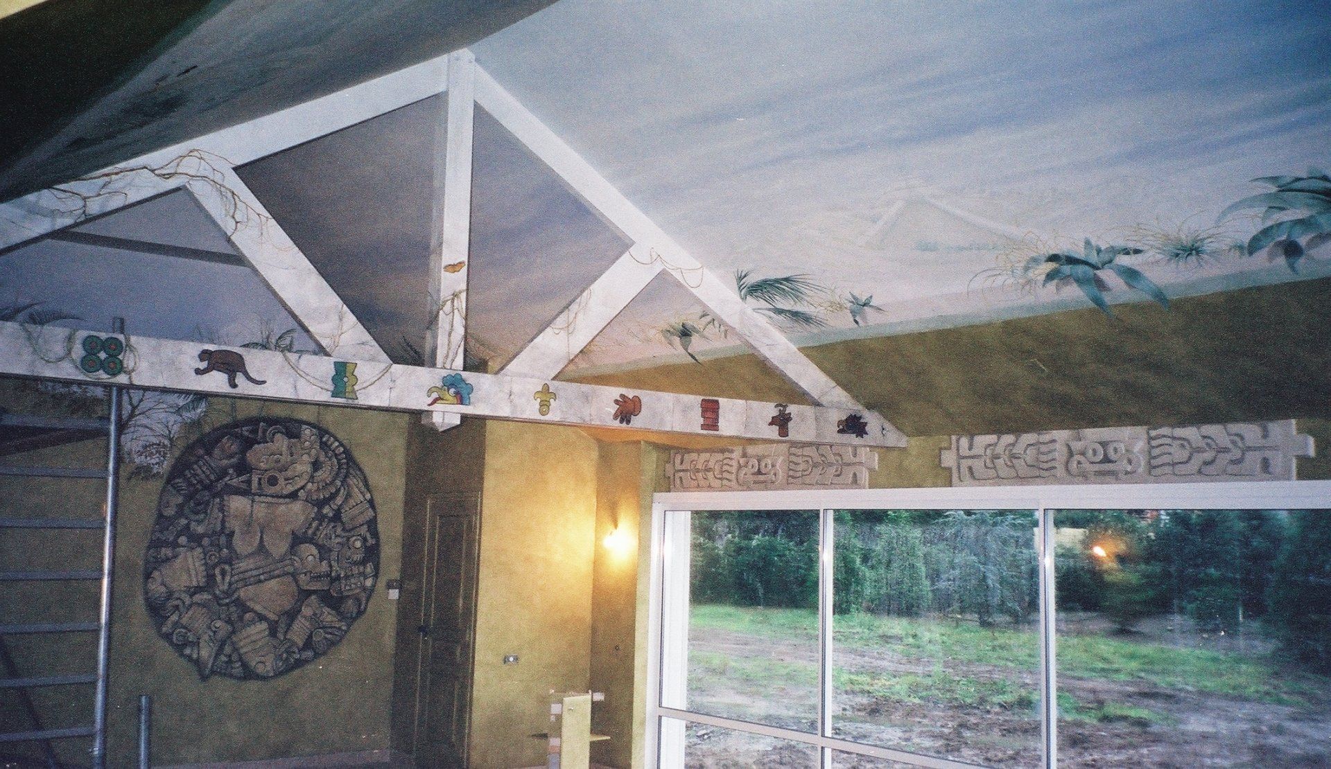 Création et réalisation sur dessus de piscine d'un décor peint / thématique "maya"