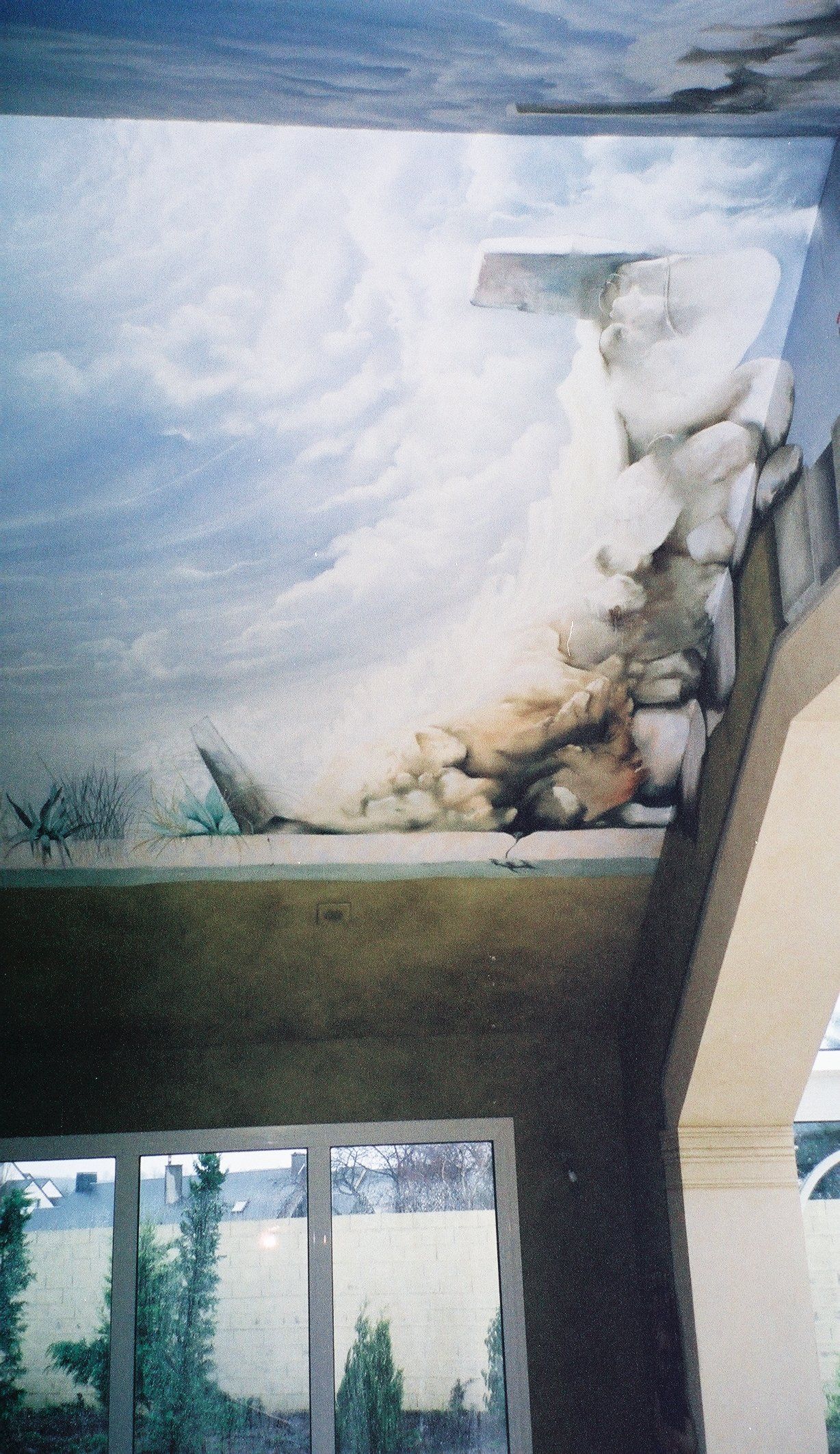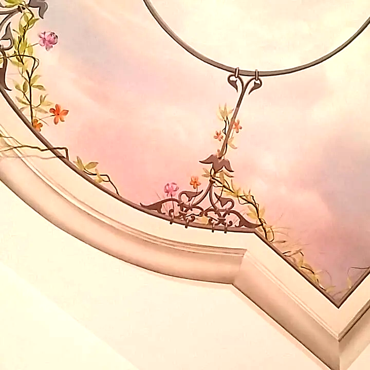 ciel en trompe l'œil avec fausse moulure, réalisation à l'huile fine, finition vernis