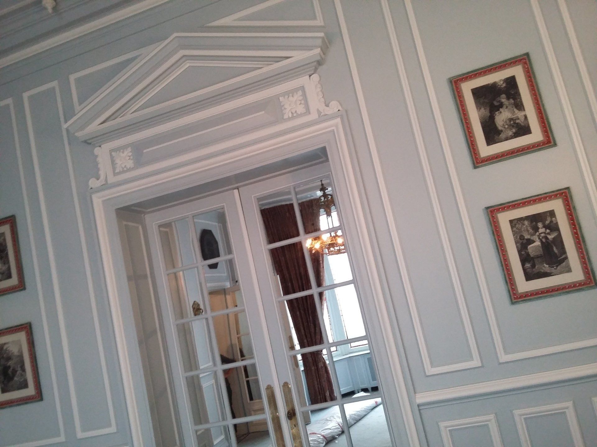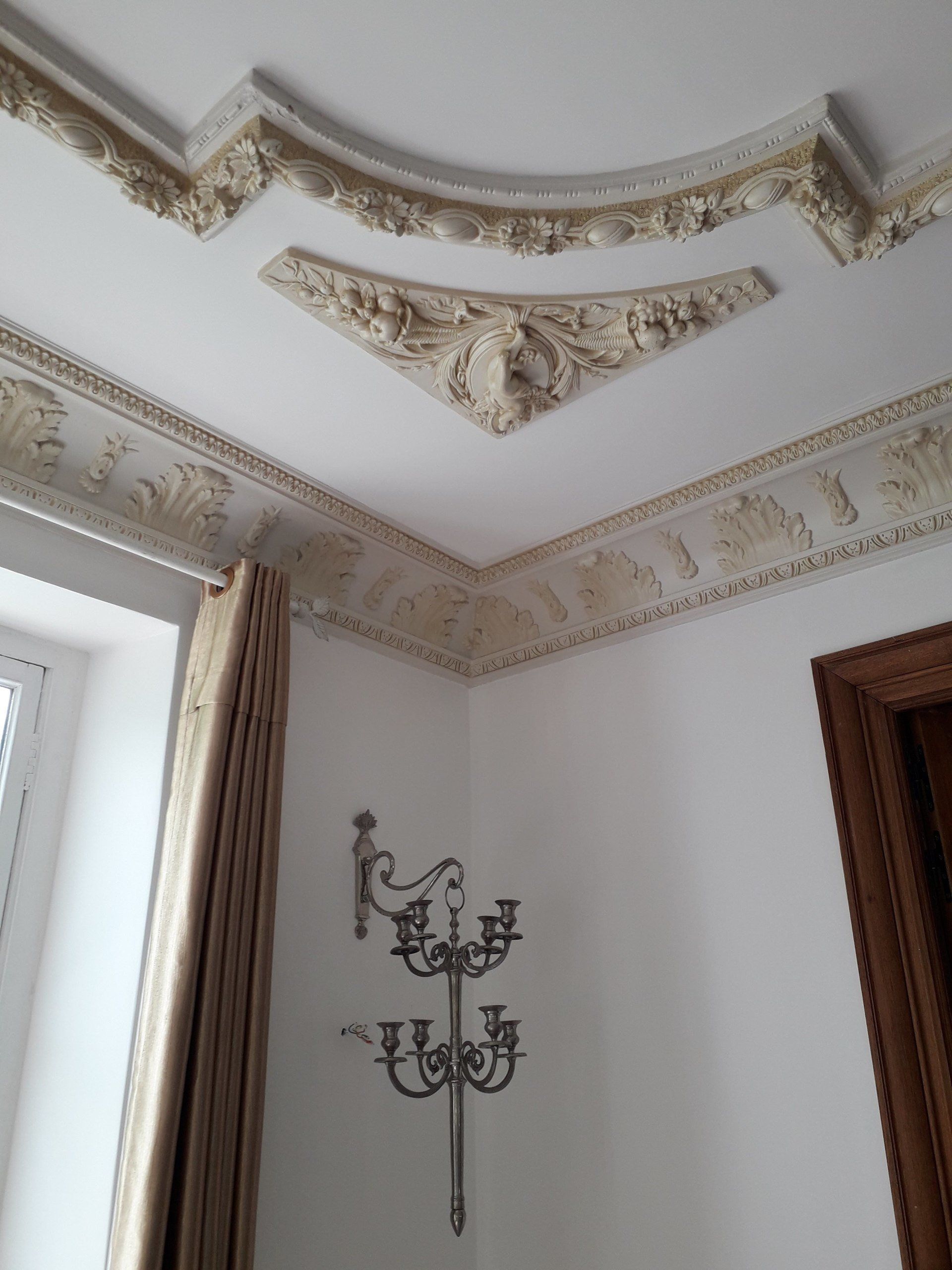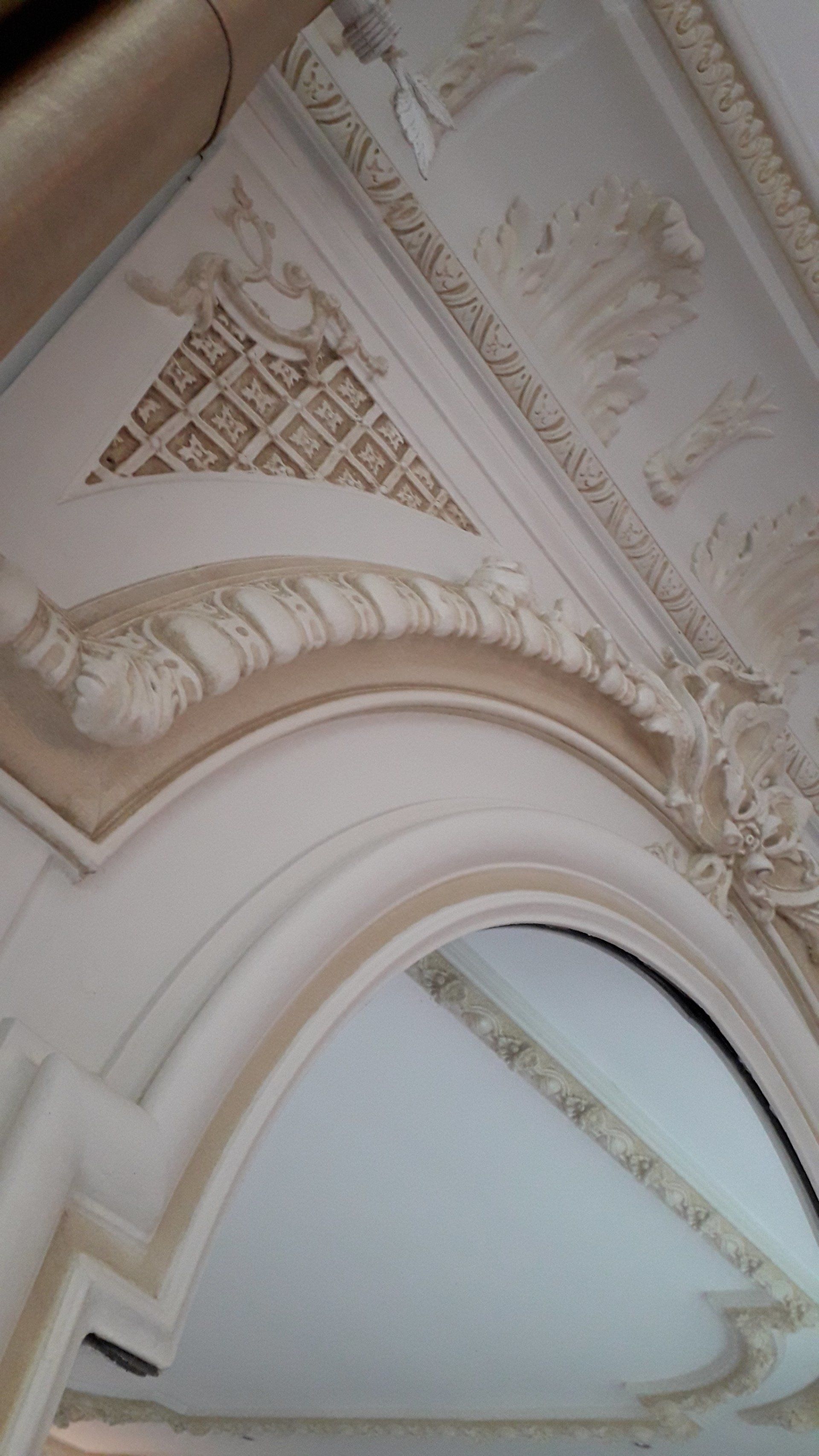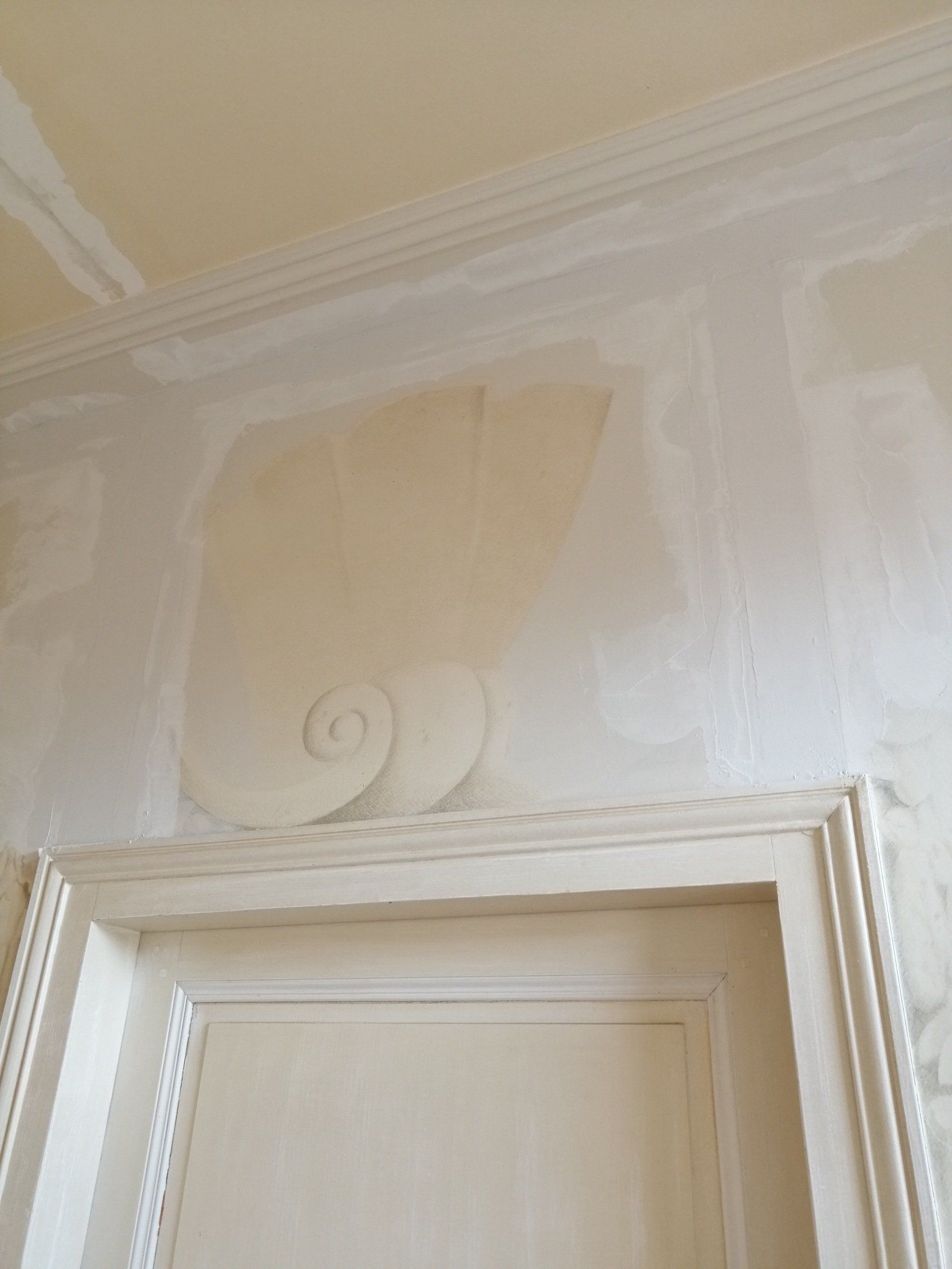 Décoration peinte en glacis à l'huile fine et vernis mat sur moulure en staff "Manoir"