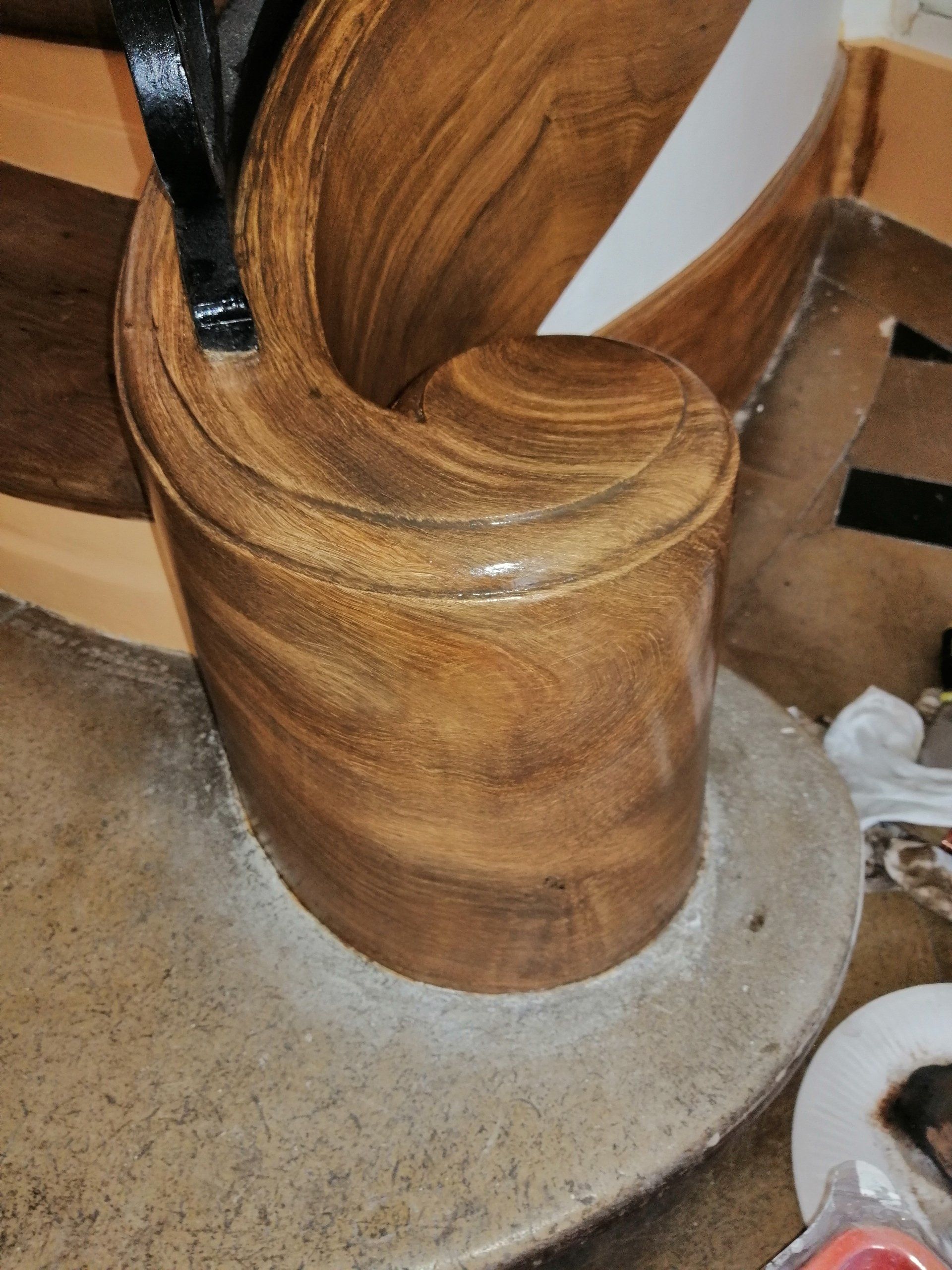 Cage d'escalier en faux bois, main courante, stylobate, plinthes, finition vernis mat